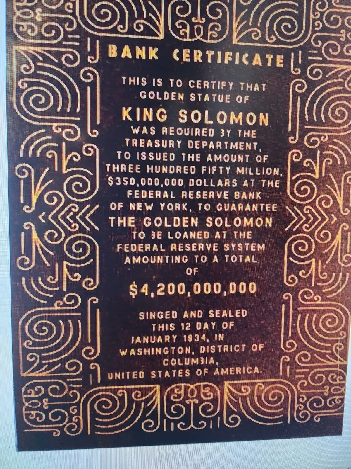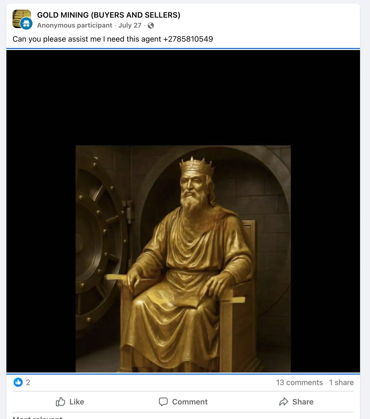 A seller operating across several Facebook groups is attempting to market what he describes as a solid gold statue of King Solomon, valued at 4.2 billion dollars. The listing includes counterfeit certificates, invented historical claims, and photographs of what is clearly a modern decorative casting.