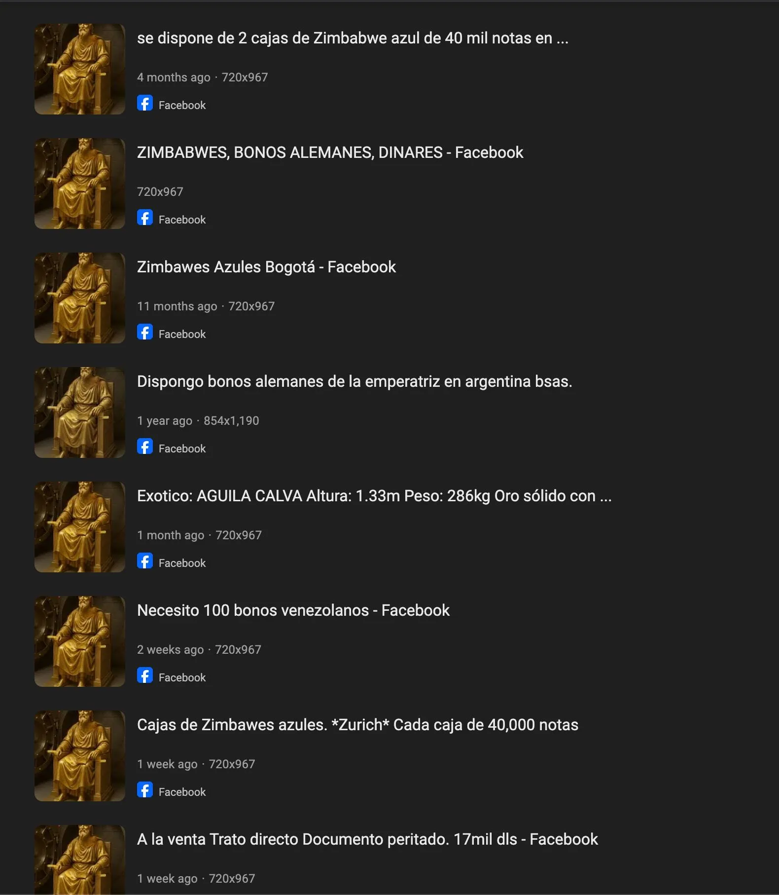 A reverse image search of the statue shows dozens of identical posts across Facebook groups related to gold, diamonds, historical bonds, and bulk currency trading. These groups often operate with tens of thousands of members and function as marketplaces for unverifiable financial instruments.